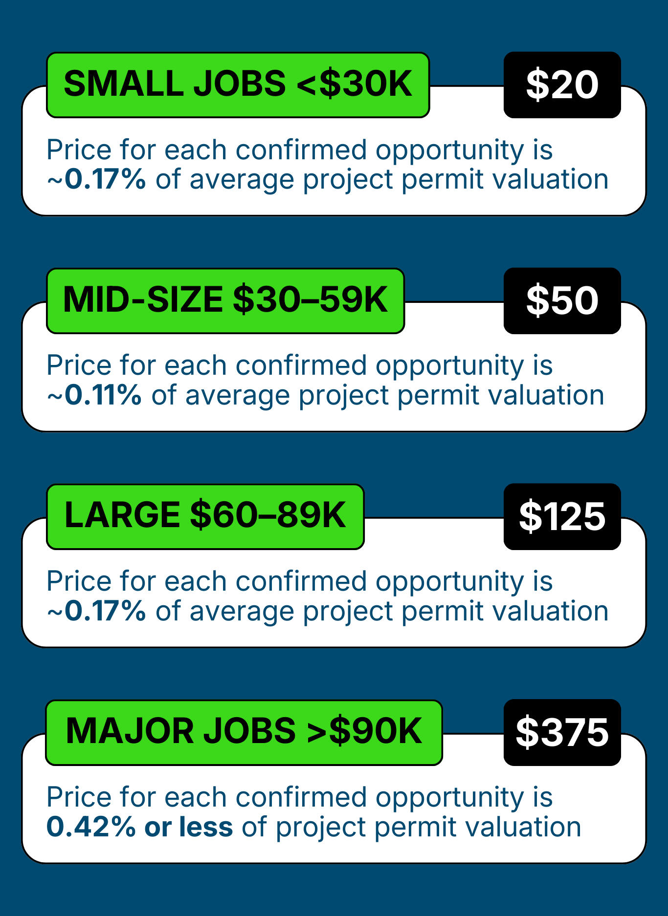 The Lead Pipe tracks new permits in your area and connects with contractors before your competitors even see they’ve filed. We proactively establish interest in receiving a quote from your company on that project’s supply needs. You only pay when that confirmed opportunity is delivered to you.